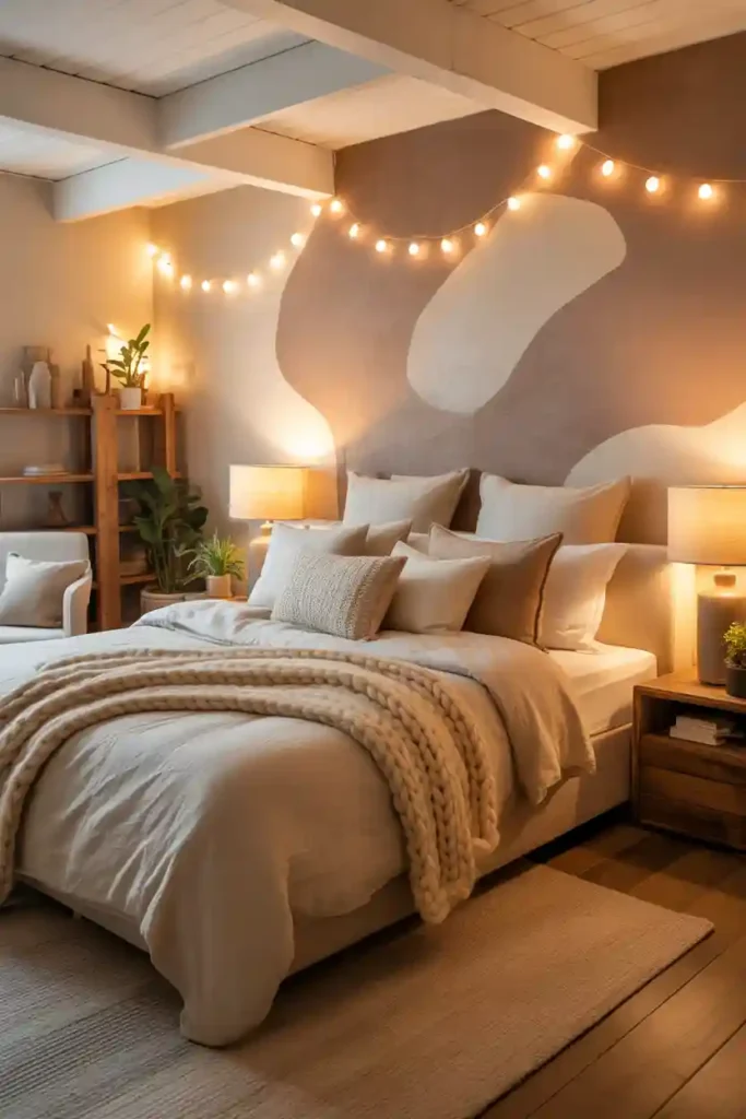 Accent lighting adds a gentle glow that enhances coziness. String lights, LED strips, or small wall lights create warmth without overpowering the space. These lights work well behind headboards, shelves, or artwork.