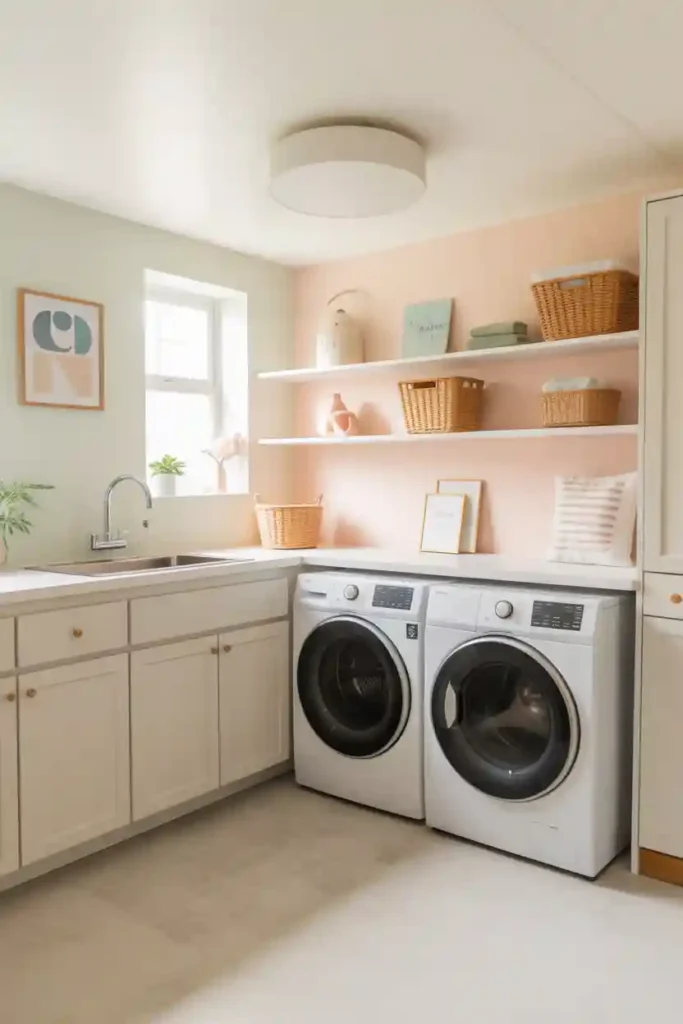 Styling shelves with neatly folded towels, clear jars, and woven baskets adds texture without clutter. Keeping items color-coordinated helps maintain a clean, uplifting look. Open shelving also provides an opportunity to add subtle decor, such as small plants or framed prints, without overwhelming the space. This approach balances functionality and brightness, making laundry tasks feel less heavy and more enjoyable.