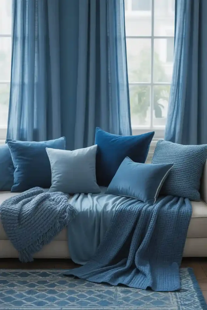 Blue textiles are an easy and flexible way to introduce calm into a living room. Cushions, curtains, rugs, and throws in various blue tones create a soothing layered look without requiring permanent changes. This approach works especially well for renters or those who prefer subtle updates.
