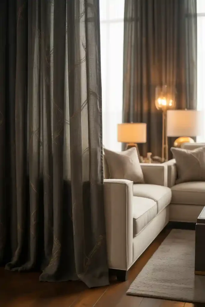 These curtains work well in classic, modern, or transitional interiors, pairing beautifully with complementary metallic décor elements such as lamps, frames, or side tables. Even small touches of gold or bronze embroidery can transform plain dark curtains into statement pieces. The metallic accents reflect light subtly, adding warmth and dimension to the room. Incorporating dark curtains with metallic details ensures the living space feels sophisticated, luxurious, and visually dynamic while maintaining a balanced, elegant aesthetic.