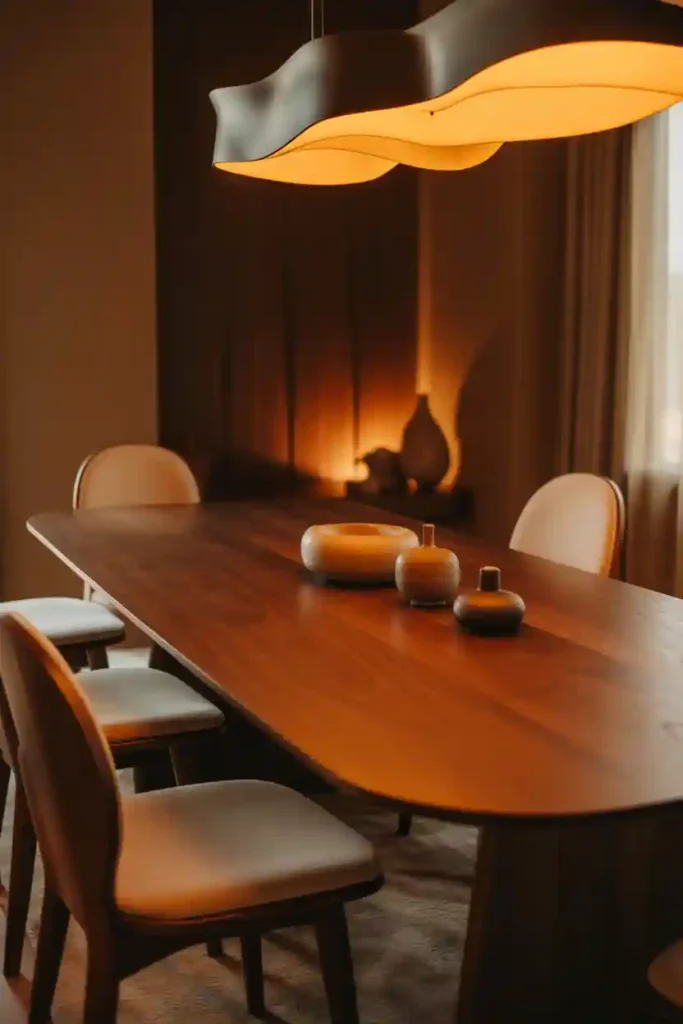 Sculptural lighting fixtures double as decorative art pieces. These designs add personality while still providing practical lighting. Unique shapes create visual interest even when the lights are off. Sculptural lighting works especially well in simple dining rooms. The fixture becomes the main decorative element. This trend combines art and function.