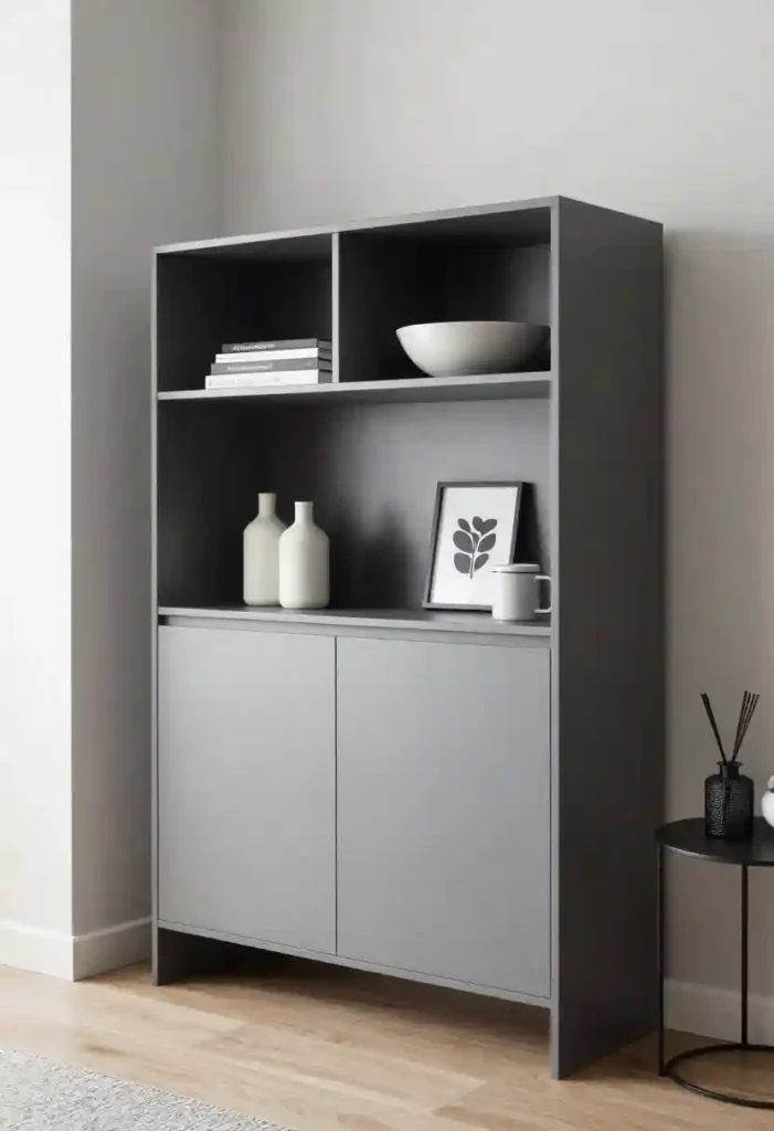 Closed doors hide clutter. Vertical storage works well in narrow spaces. It improves organization. Tall cabinets create efficient storage.