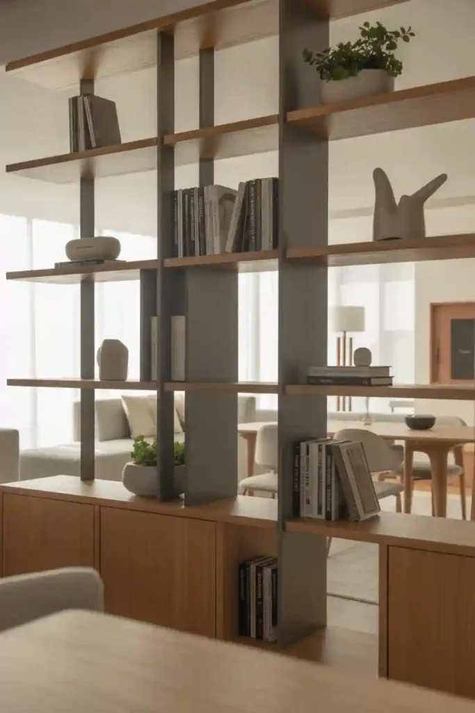 Room dividers with built-in storage are perfect for creating distinct zones in open-plan spaces while adding practical storage. Shelving dividers can hold books, baskets, or decorative objects, keeping items organized and accessible. Open designs allow light to pass through and prevent the space from feeling closed off. This makes them ideal for living-dining combos, studio apartments, or shared spaces.