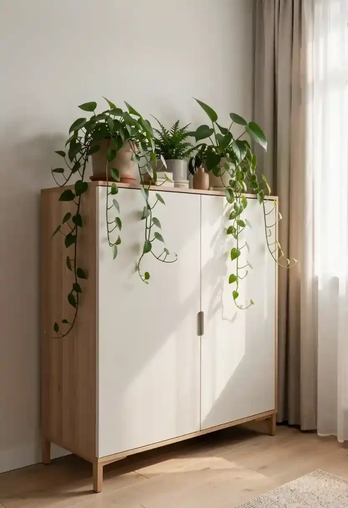 The space above cabinets or wardrobes often goes unused, but it can be a great place to add plants. Placing a few leafy plants on top of cabinets introduces greenery at eye level and fills empty vertical space.