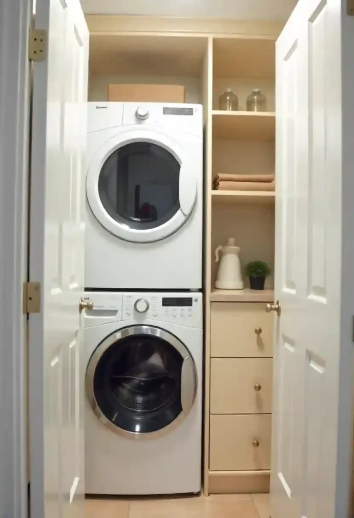 A stackable washer and dryer is a smart solution for small laundry rooms. Stacking appliances frees up valuable floor space, allowing room for storage or folding areas. This layout works well in narrow rooms, closets, or hallways. Stackable units offer the same performance as full-size machines while using less space. Placing shelves or cabinets next to the appliances adds even more function. This idea helps create a streamlined and efficient laundry area. Using front-loading machines ensures safe stacking and easy access. Stackable setups are ideal for homes that need practical solutions without sacrificing performance.
