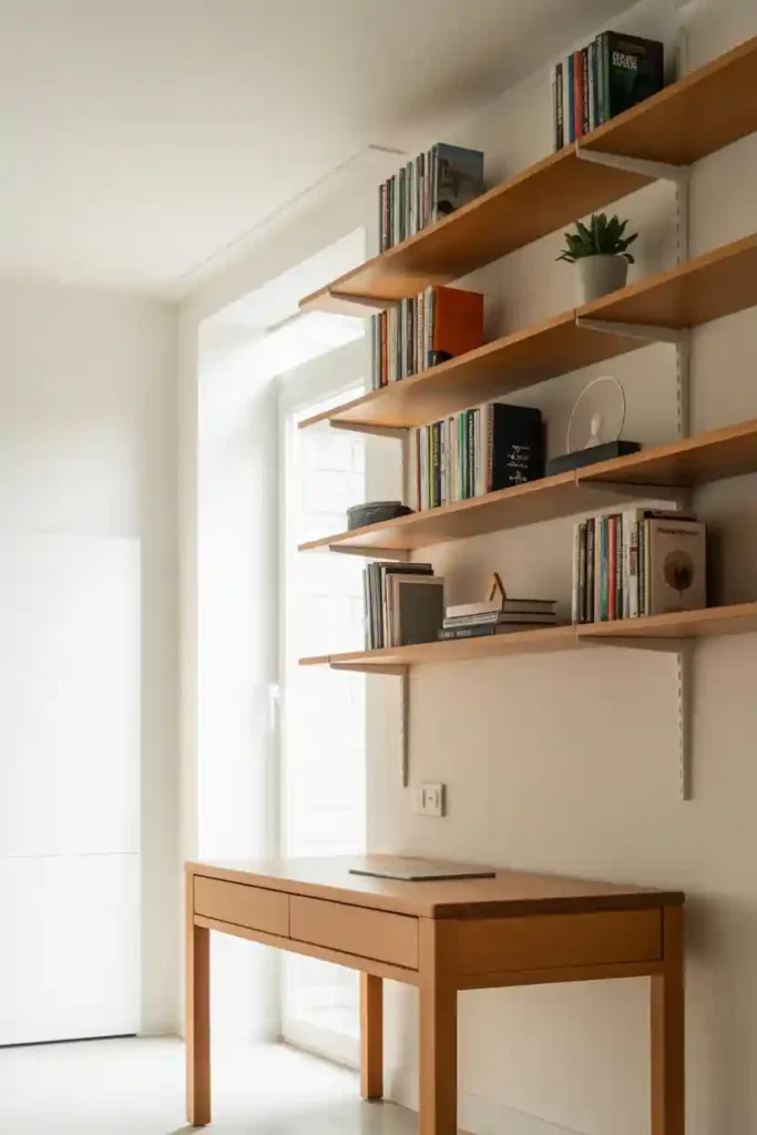 Floating wall bookshelves are perfect for small offices because they utilize vertical wall space instead of occupying the floor. These shelves can hold books, office supplies, and décor while keeping the workspace open and uncluttered. Because they are mounted to the wall, they create a sense of airiness and prevent the room from feeling cramped.